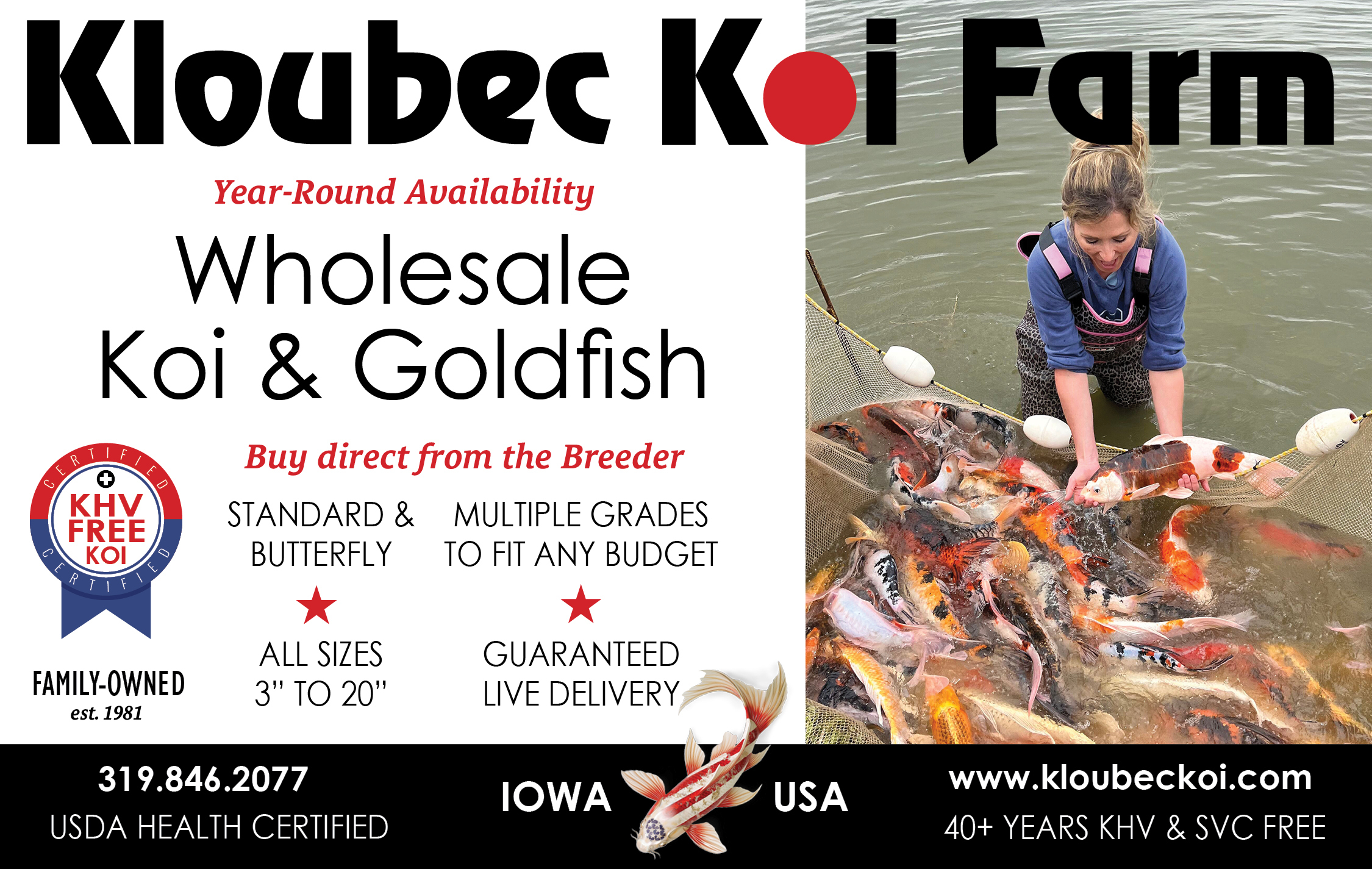Kloubec Koi Farm offers year-round availability. With the addition of our 3rd indoor koi house we have nearly one acre under roof for producing the best koi in the USA. All orders are shipped via UPS Next Day Air service. This door-to-door method ensures that every order arrives live and healthy, ready to sell to your customers.
